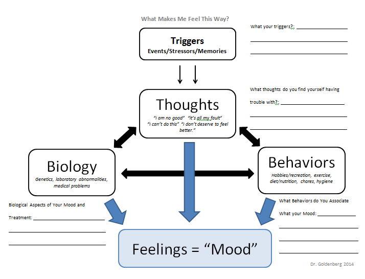 The other area depression comes from is our environment. Stressors and triggers at home and work and memories can all negatively impact our thoughts. Negative thoughts not only impact our mood and feelings but our behavior and biology as well. (See the figure below). For example, depression can lead to self-isolation, poor diet and limited exercise. All of these factors negatively impact our biology. We know that the brain and its neurotransmitters change during an episode of depression and again during recovery. (See the image below.) Depression negatively impacts our behavior by decreasing engagement in recreational activities and making chores and hygiene more likely to be deferred. Not being able to keep up with responsibilities at work and at home can lead to additional negative thoughts, including “being a failure”. Ever increasingly negative thoughts, biology and behavior all then enhance the feeling of depression. It is truly a vicious cycle. What starts as something minimal can quickly snowball into