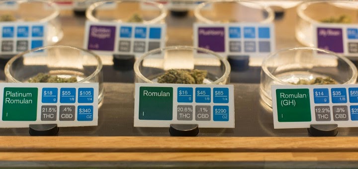 | These price tags show the THC and CBD contents of the Marijuana. |