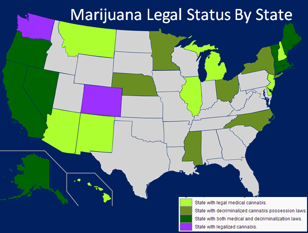 We know that Marijuana is the most commonly used illicit substance in the U.S and around the world. We know that two states (Washington and Colorado) have legalized recreational use and other states have passed laws legalizing medial use and/or decriminalizing recreational use.